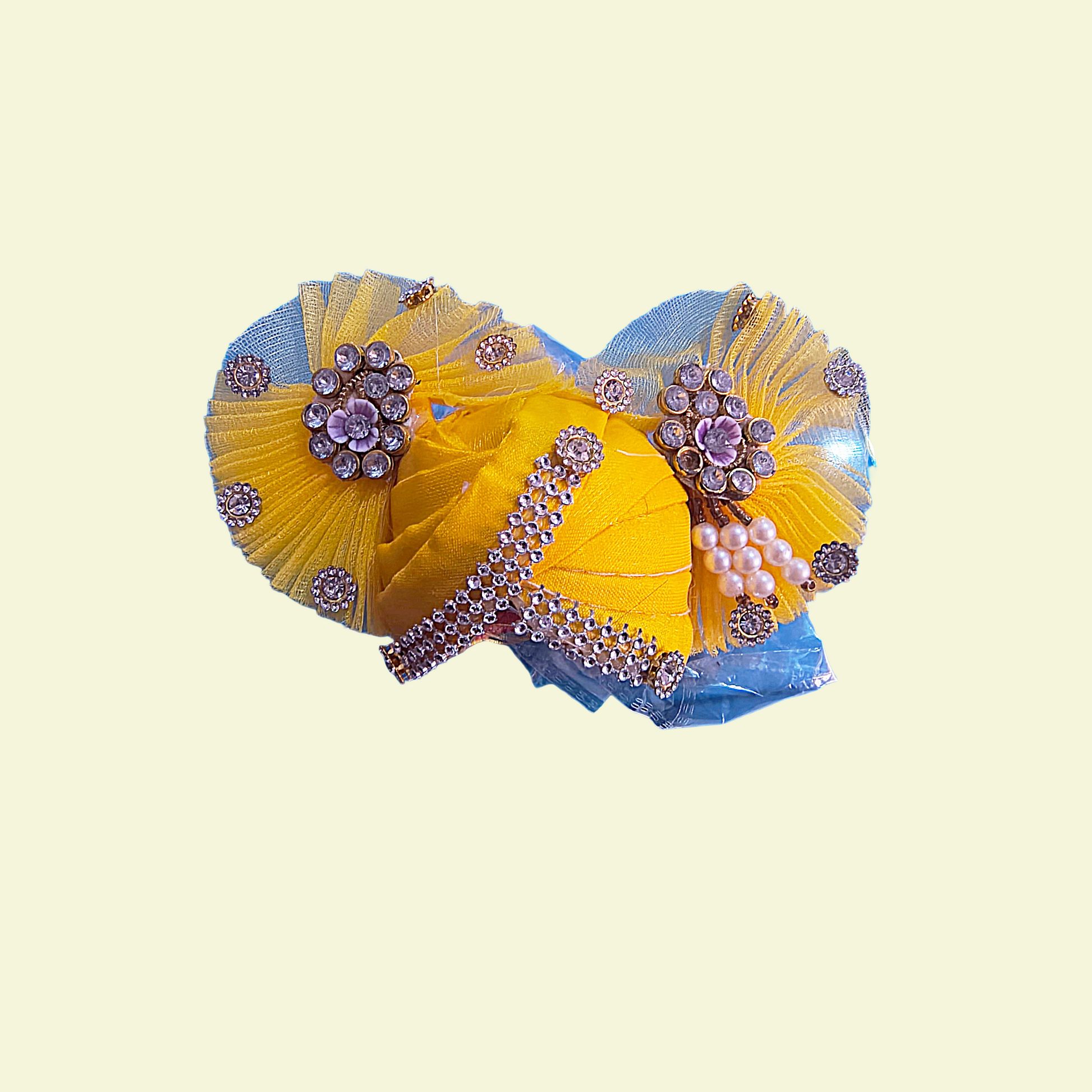 Crafted with fine detailing, this crown comes in a vibrant yellow-golden design, adorned with shimmering embellishments, delicate embroidery, and a radiant peacock feather motif that signifies purity and auspiciousness. The elegant fan-shaped design at the top, finished with sparkling stones, gives it a majestic touch, making it perfect for both traditional worship and festive decoration.